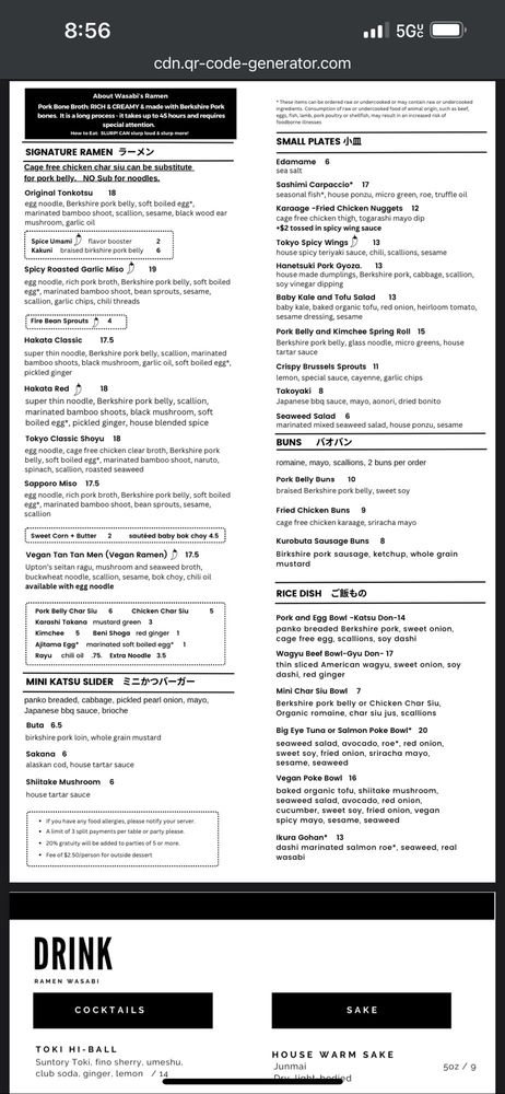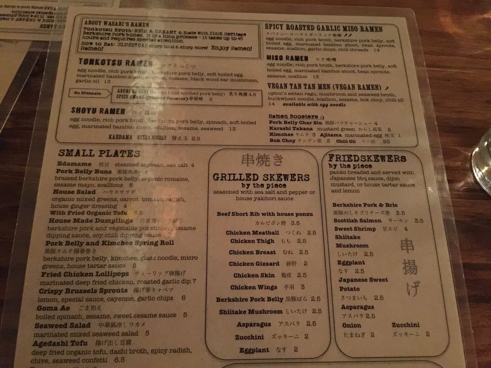 Ramen Wasabi, located in Chicago, is a beloved spot for ramen enthusiasts. Known for its cozy atmosphere, quick service, and flavorful dishes, this izakaya offers a variety of options for different dietary preferences - from pescatarian to vegan. The menu boasts popular items like chicken karaage, Sapporo Miso ramen, and Original Tonkotsu ramen, all prepared to perfection. Customers praise the quality of food, attentive service, and reasonable prices. Whether you opt for the spicy garlic miso ramen or the vegan ramen, each bowl is packed with umami and satisfying flavors. The pork belly bun and Takoyaki appetizers are also highly recommended. With its vibrant ambiance and diverse menu, Ramen Wasabi is a must-visit for a delicious and fulfilling dining experience.